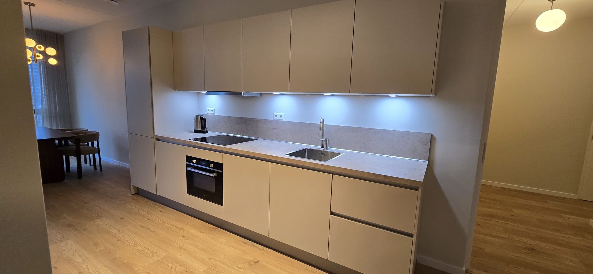 The open kitchen is equipped with an oven, microwave, electric hob with an integrated hood, refrigerator, freezer dishwasher, vacuum cleaner and washing machine.