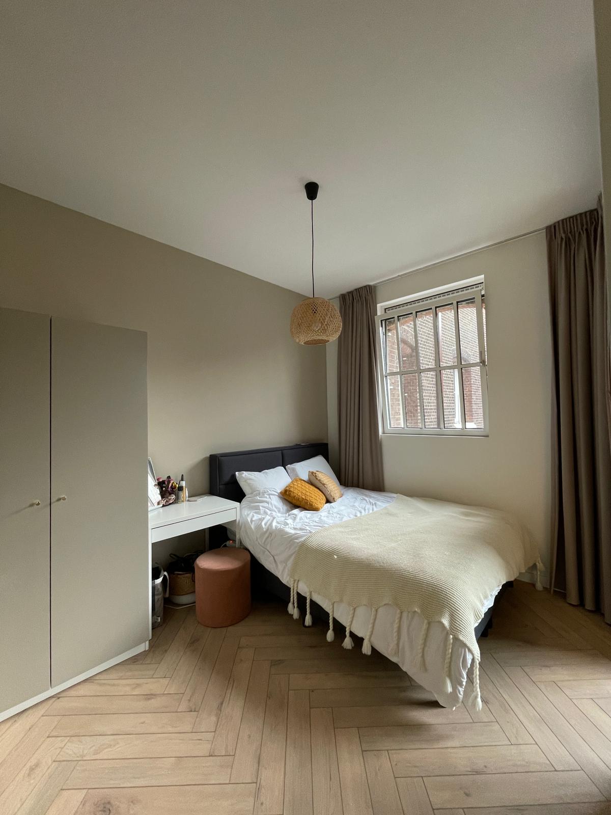 The 45 m2 apartment is on the second floor. The apartment has a hallway with a separate toilet, open kitchen and living room. The bathroom has a modern-design and is accessible via the bedroom. There is a separate space for a washing machine. Both the livingroom and bedroom have plenty of sunlight due to the floor to ceiling length windows.