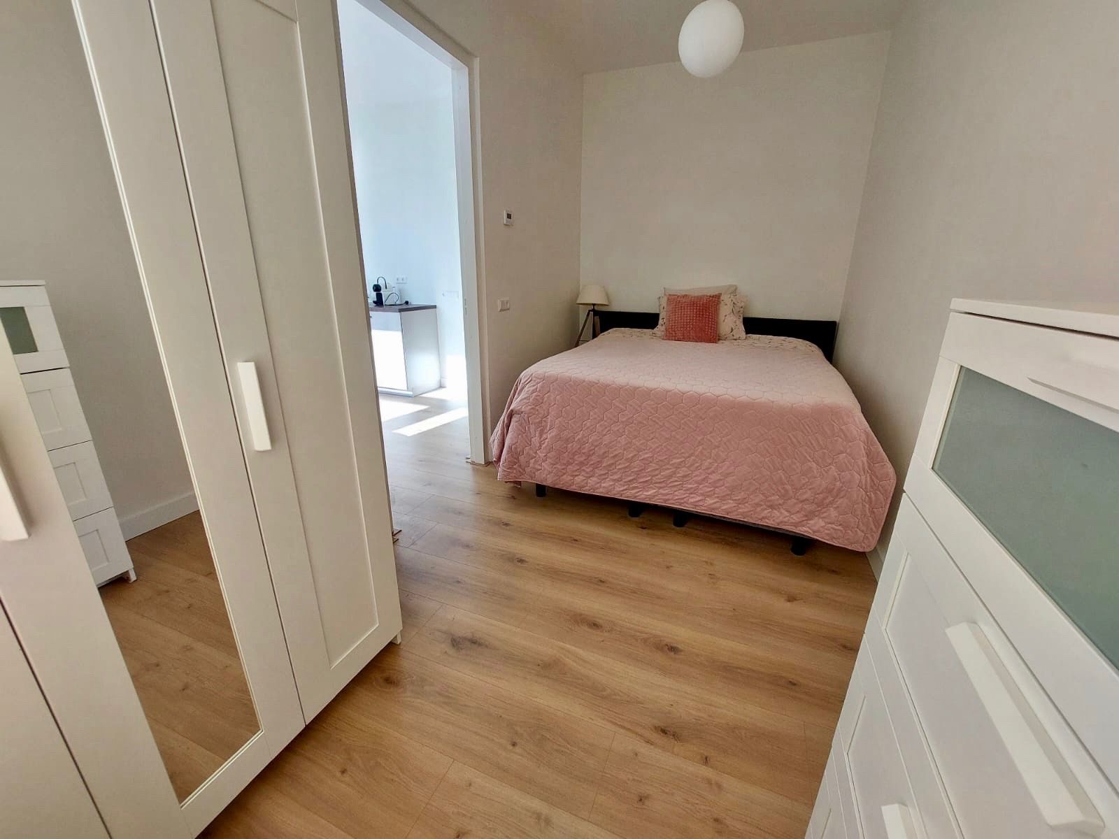 The apartment features a spacious bedroom with a peaceful view of the green communal courtyard. The building itself is beautifully designed and finished with high-quality materials.